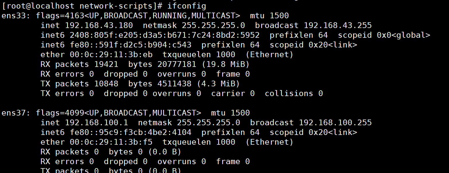 场景:有两台机器A和B。A机器有两个网卡,ens33(192.168.43.180)和ens37(192.168.100.1),ens33可以使用外网,ens37只能使用内网。B机器只有ens33(192.168.100.1)网卡,不能使用外网,但可以与A机器互通。