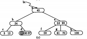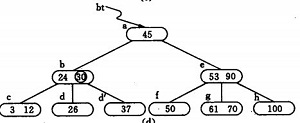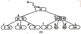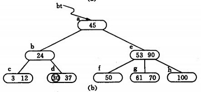 (1)首先通过查找确定插入的位置。由根节点a开始查找,确定30应插入的在d 节点中。由于d 中关键字数目不超过2(即m-1),故第一个关键字插入完成:如图(b)