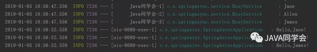我们看到名字前缀为“Java同学会”前缀的3个线程,打印了busyMethod方法中的日志。因为busyMethod方法是我们定义的Executor线程池中的线程执行的。我们再看看test方法和busyMethod方法中日志打印的时间,它们相隔了5秒,说明test方法中的CompletableFuture.allOf(jane,allen,james).join()一直在等待,等待所有调用的异步方法都执行完,才继续执行。