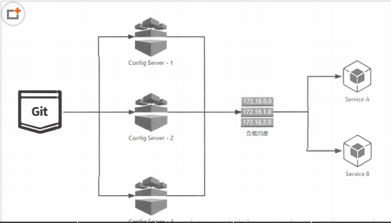 传统模式:不需要为这些服务端做任何额外的配置,只需要遵守一个配置规则,将所有的Config Server都指向同一个Git仓库,这样所有的配置内容就通过统一的共享文件系统来维护。而客户端在指定Config Server位置时,只需要配置Config Server上层的负载均衡设备地址即可, 就如下图所示的结构。
