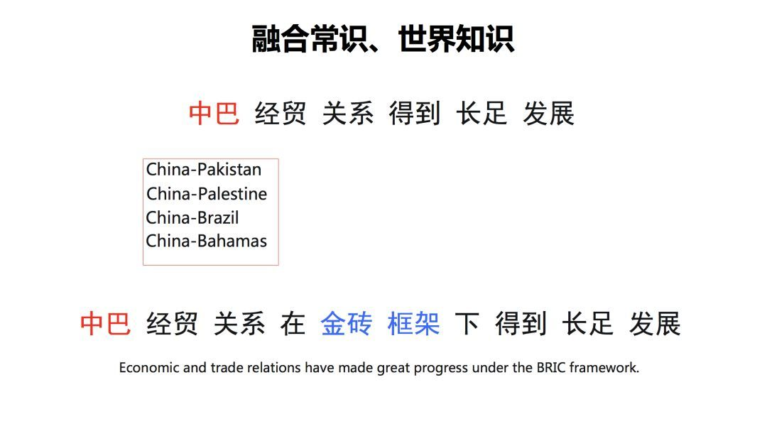 但是下面的句子,有一个限定,“金砖框架”。这个时候,人们就知道该如何翻译了。但是,机器能不能知道?大家可以去翻译引擎上去验证。因为人是知道中国跟哪些国家是金砖国家,但是机器没有这个知识。怎么把这个知识交给机器去做,这是一个非常挑战的问题。