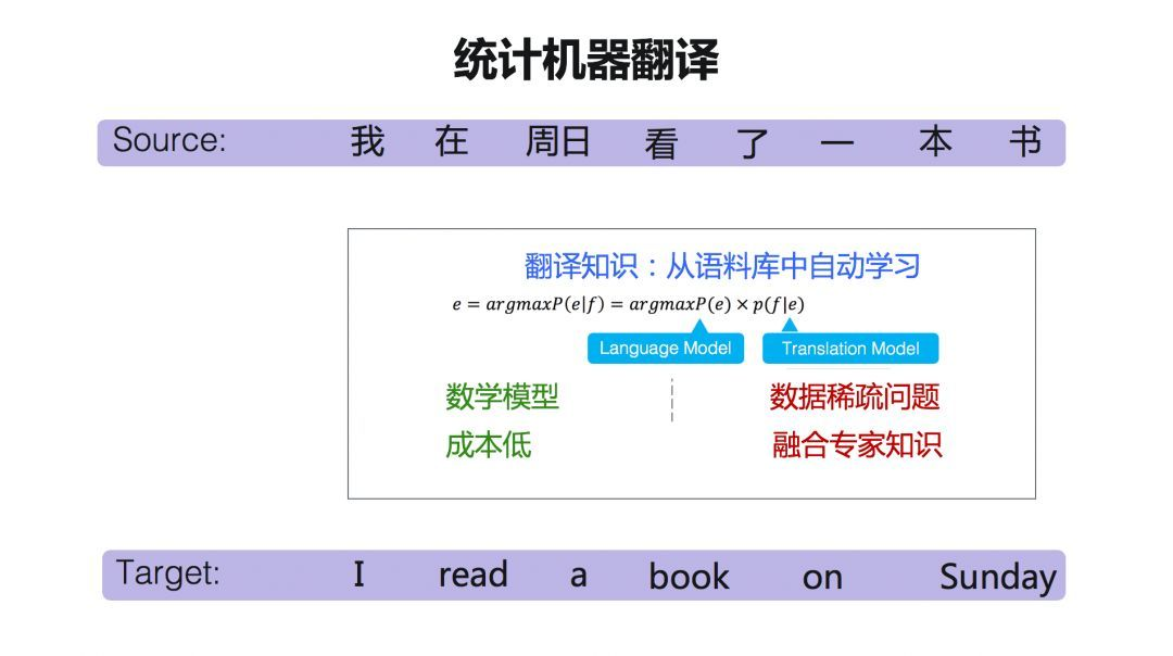 它的成本是非常低的,因为这个方法是语言无关的。一旦这个模型建立起来以后,对所有的语言都可以适用。统计机器翻译是一种基于语料库的方法,所以如果是在数据量比较少的情况下,就会面临一个数据稀疏的问题。同时,也面临另外一个问题,其翻译知识来自大数据的自动训练,那么如何加入专家知识? 这也是目前机器翻译方法所面临的一个比较大挑战。
