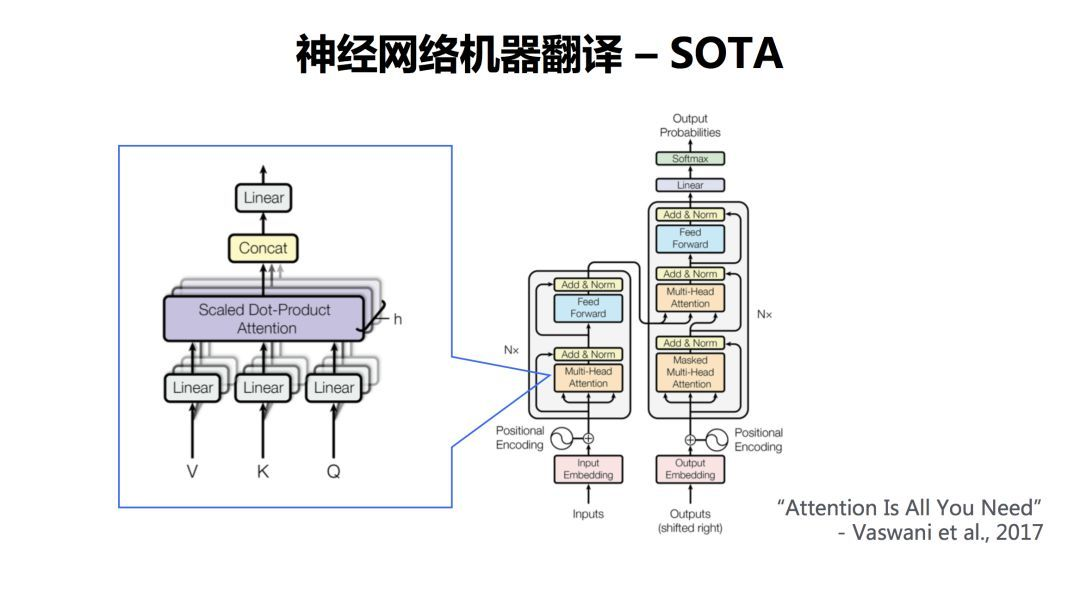去年以来出现了一个大杀器,TRANSFORMER。基本上取得了目前来说神经网络机器翻译最好的效果。TRANSFORMER的改进在哪里,来源一篇谷歌的论文,叫“Attention Is All You Need”。上文提到有一个注意力机制,这篇论文所提出的方法,可以只用注意力机制就把翻译搞定了。