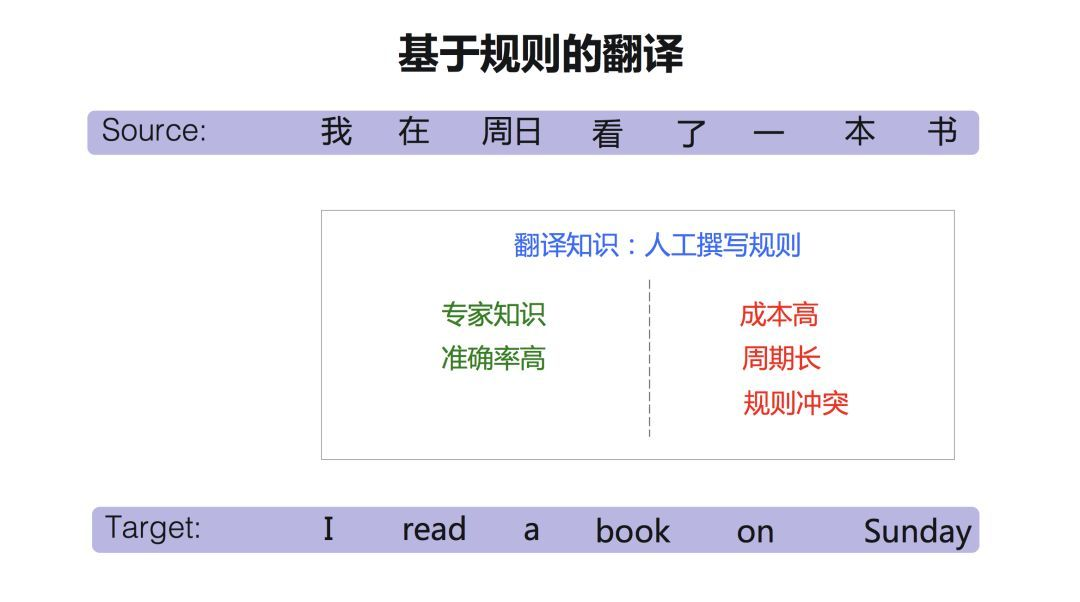 基于规则的翻译,翻译知识来自人类专家。找人类语言学家来写规则,这一个词翻译成另外一个词。这个成分翻译成另外一个成分,在句子中的出现在什么位置,都用规则表示出来。这种方法的优点是直接用语言学专家知识,准确率非常高。缺点是什么呢?它的成本很高,比如说要开发中文和英文的翻译系统,需要找同时会中文和英文的语言学家。要开发另外一种语言的翻译系统,就要再找懂另外一种语言的语言学家。因此,基于规则的系统开发周期很长,成本很高。