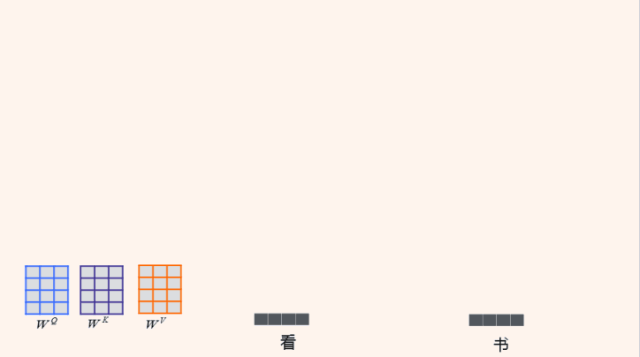 论文中,把每一个词都用三个向量表示,一个叫Query(Q),一个叫Key(K),另外一个是Value(V)。那怎么得到一个词的Query、Key和Value呢?左边有三个矩阵,WQ、WK和WV,只要跟每一词向量相乘,就能够把这个词转换成三个向量表示。那么目标是什么,我们想把『看』这样一个词,通过一系列的网络变换,抽象到高维的向量表示。