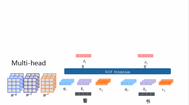 通过Q和K进行点积,并通过softmax得到每个词的一个attention权重,在句子内部做了一个attention,称作Self Attention。Self Attention可以刻画句子内部各成分之间的联系,比如说“看”跟“书”之间就建立了联系。这样,每个词的向量表示(Z)就包含了句子里其他词的关联信息。