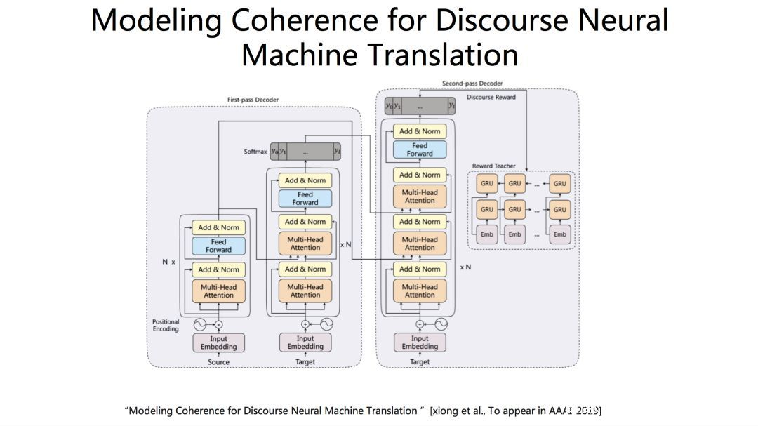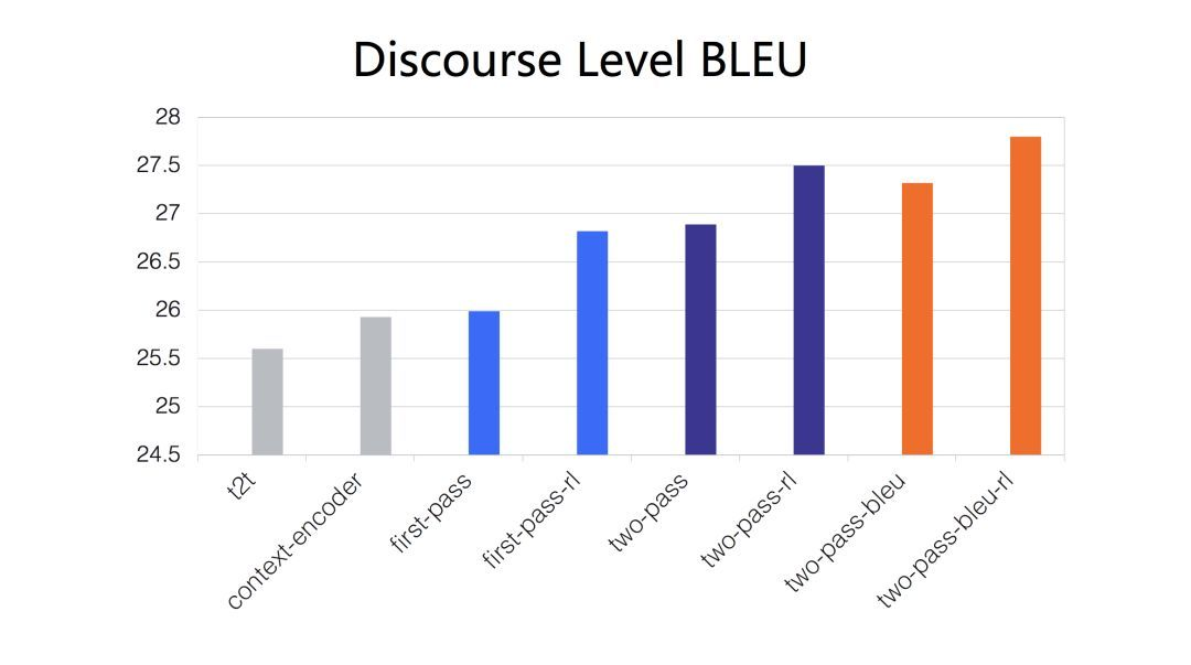 我们提出了一个两步解码的方法。在第一轮解码中单独生成每个句子的初步翻译结果,在第二轮解码中利用第一轮翻译的结果进行翻译内容润色,并且提出使用增强式学习模型来奖励模型产生更流畅的译文。这是我们系统输出的一个结果,整体上,流畅度提高了。 具体细节,可以去看论文。