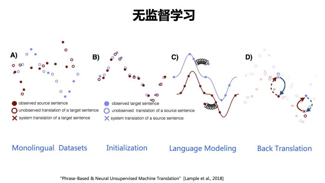 首先我要做一个初始化,B)是初始化。首先构建一个词典,把这两种语言之间的词做一下对齐。C)是语言模型,基于单语数据,可以训练语言模型,用来衡量这个语言的流利度。那么D)是什么? D)是一个称作Back Translation的技术,是目前大家常用的一个用于增强数据的方法。