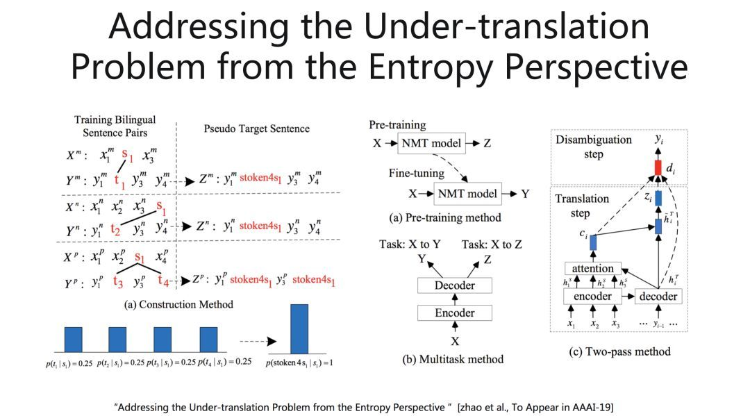 左边的例子,S1对应3种不同的翻译,(s1,t1) (s1,t2) (s1, t3 t4),它的熵就比较大。我们把所有对应的翻译统一替换为一个特殊词『stoken4s1』,以降低词语翻译的熵值。右边呢是我们提出来的三种方法,去改善翻译结果,包括pre-training, multitask learning, two-pass decoding。大家有兴趣的话,可以去看论文。