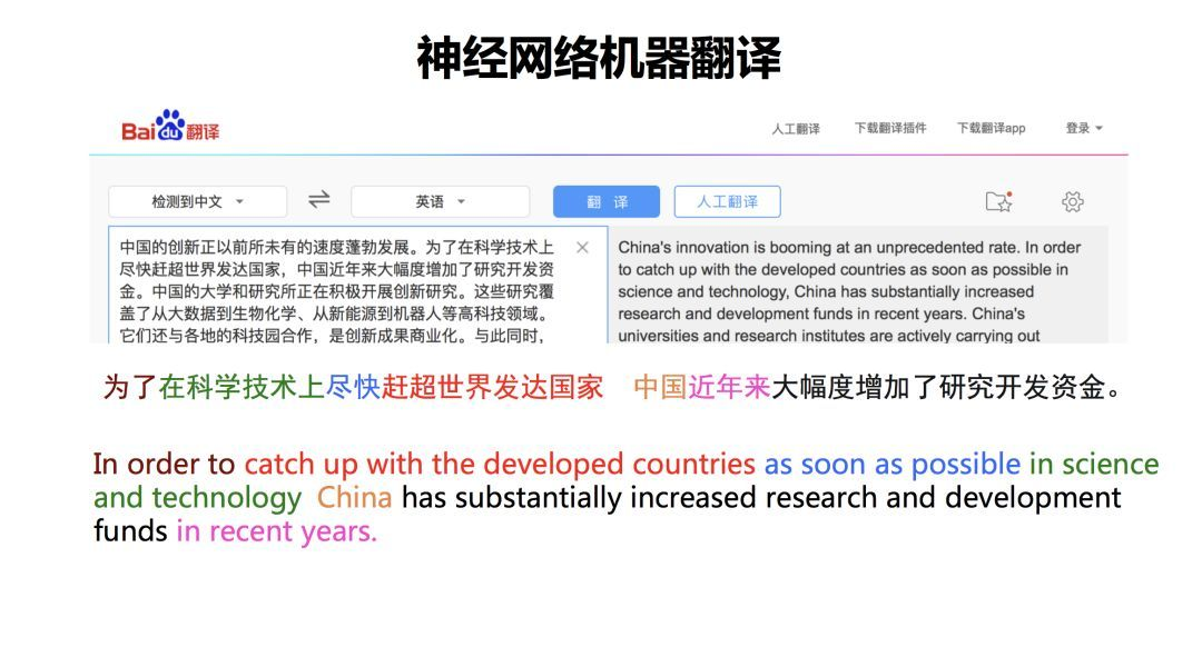 我们通过一个例子,直观的感受一下神经网络方法的译文质量。这个例子是某一年的大学英语六级考试的翻译真题。这个例子我飘了不同的颜色,表示两种语言句子成分的对应关系。从颜色上我们可以看出来,与原文相比,译文的词语顺序发生了比较大变化。比如说,中文句子中的『尽快』, 在英语端,『as soon as possible』换到后面去了,进行了比较长距离的调序。这在统计机器翻译时代是非常难做的事情,但是神经网络翻译能够把它处理的很好。