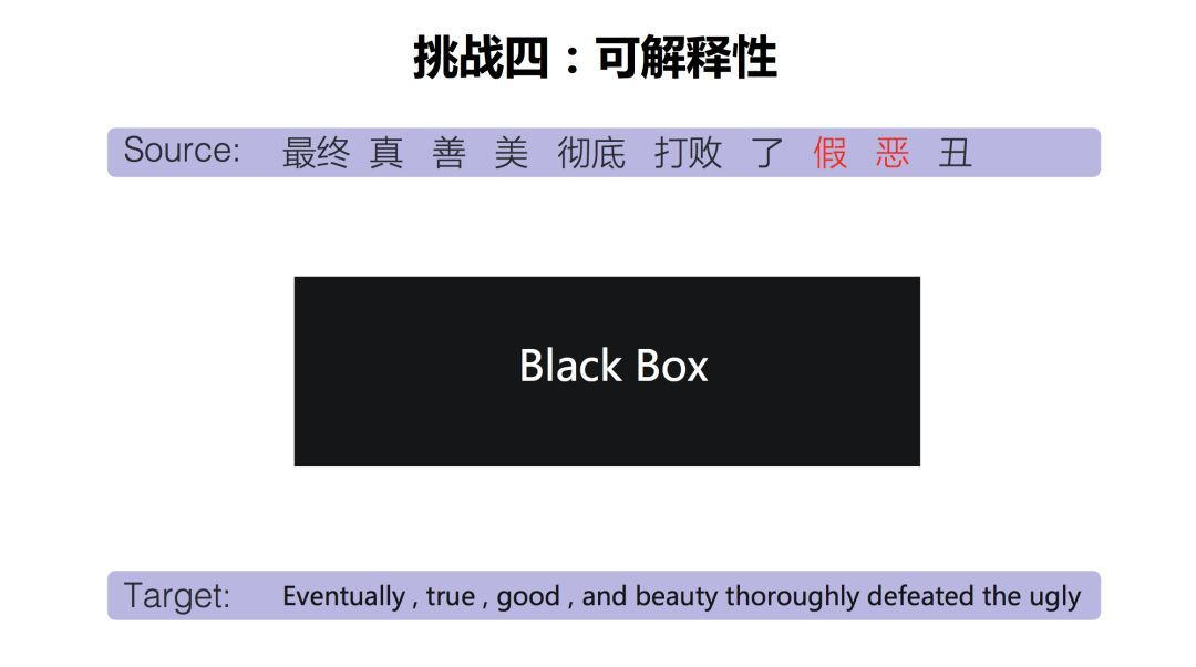 还有一个挑战,是可解释性:神经网络翻译到底是神还是神经?虽然人们可以设计和调整网络结构,去优化系统,提高质量。但是对于该方法还缺乏深入的理解。