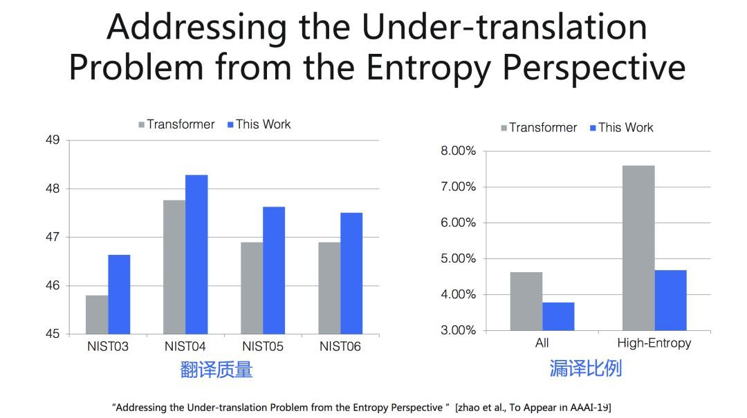 从实验结果来看,相比Transformer,在中英翻译质量上有显著提高,高熵值词语的漏译比例显著下降。