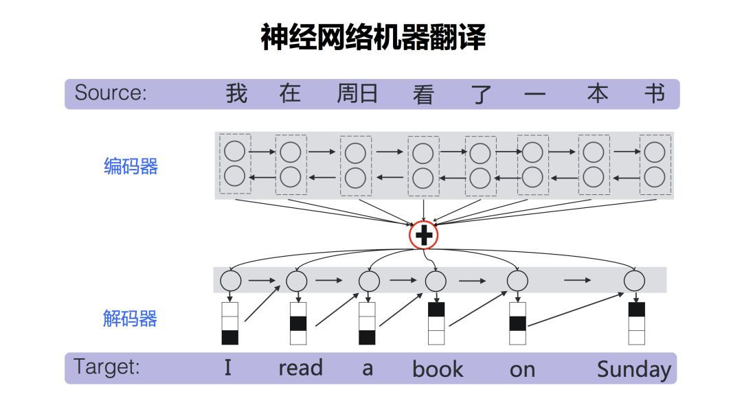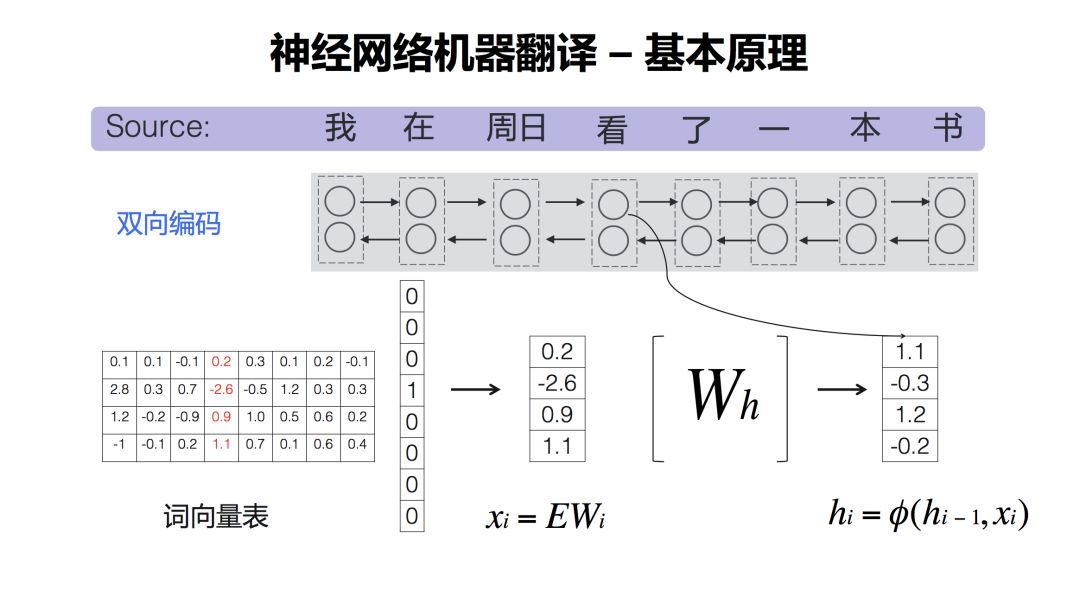 为什么做了一个双向的编码?是为了充分利用上下文信息。比如说,如果只是从左往右编码,“我在周日看”,看的是什么呢?“看”后面的你不知道,因为你只得到了“看”前面的信息。那么怎么知道后面的信息呢,这时候我们就想那能不能从后面到前面再进行一个编码,那就是“书本一了看”,从后面往前的编码,这时候“看”呢既有前面的信息,也有后面的信息。所以它有了一个上下文的信息,可以进一步提高译文质量。