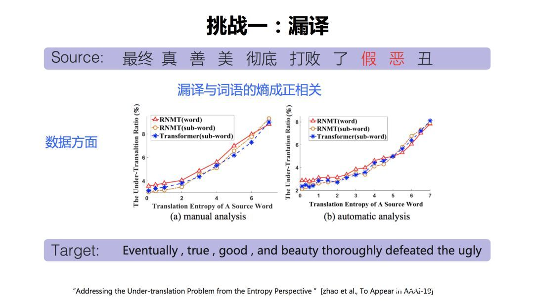 漏译的原因是什么,如何解决这个问题?这方面有很多工作,下面我就从几个方面去讲一下。我们今年有一篇论文从数据方面去分析。我们发现漏译与词语的熵成正相关关系,这个词的熵越大,漏译的可能性越大。它所对应的目标语言词越多,概率越分散(熵越大),越有可能被漏译。