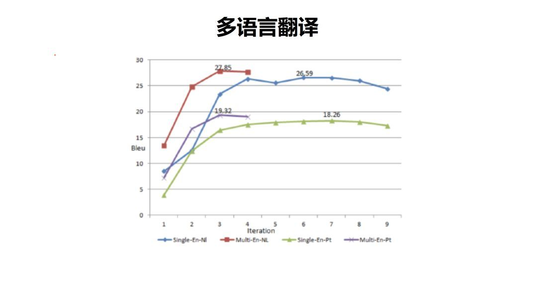 针对数据稀疏问题,我们提出了一个多任务学习的多语言翻译模型。在进行多语言翻译的时候,源语言共享编码器,在解码端,不同的语言,使用不同的解码器。这样在源语言端就会共享编码器的信息,从而缓解数据稀疏问题。后来,加拿大蒙特利尔大学、Google等在此方向上陆续开展了多个工作。