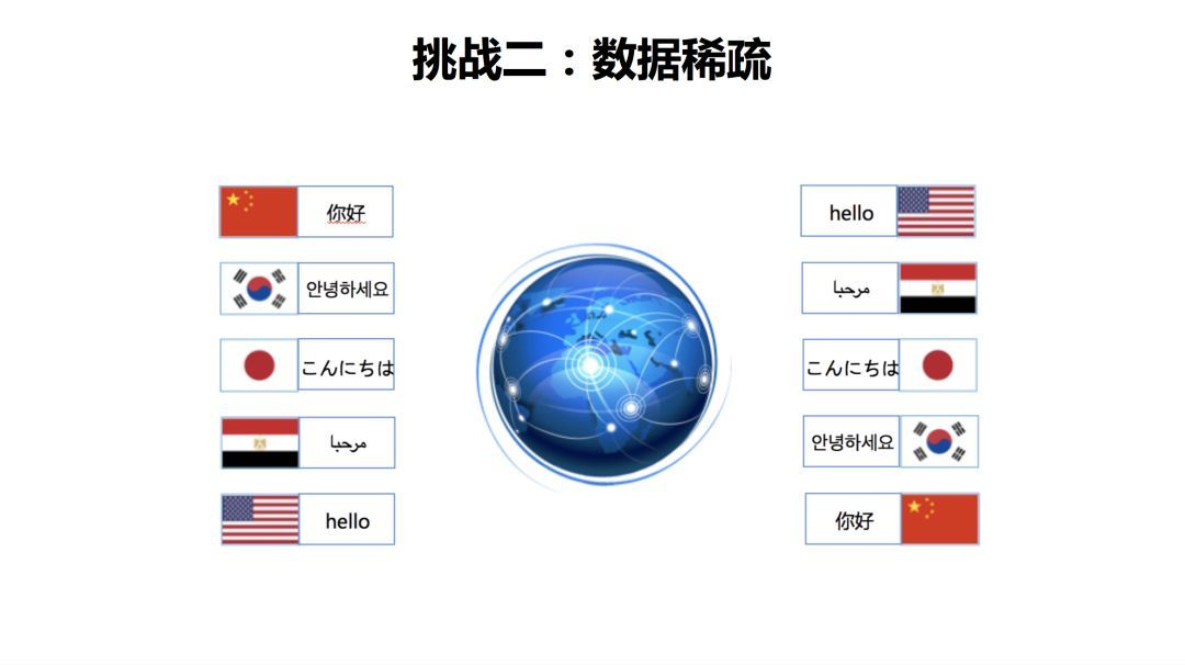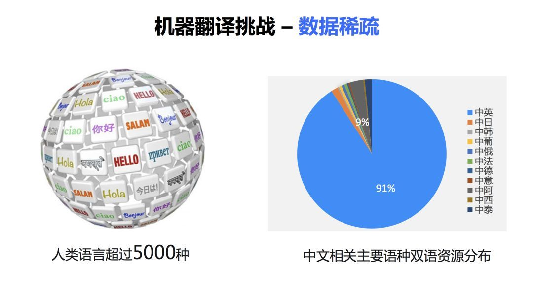 第三个挑战,数据稀疏。据不完全统计,现在人类的语言大约有超过五千种。现在的机器翻译技术大部分都是基于大数据的,只有在大量的数据上训练才能获得一个比较好的效果。而实际上,语言数量的分布非常不均匀的。右边的饼图显示了中文相关语言的一个分布情况,大家可以看到,百分之九十以上的都是中文和英文的双语句对,中文和其他语言的资源呢,是非常少的。在非常少的数据上,想训练一个好的系统是非常困难的。