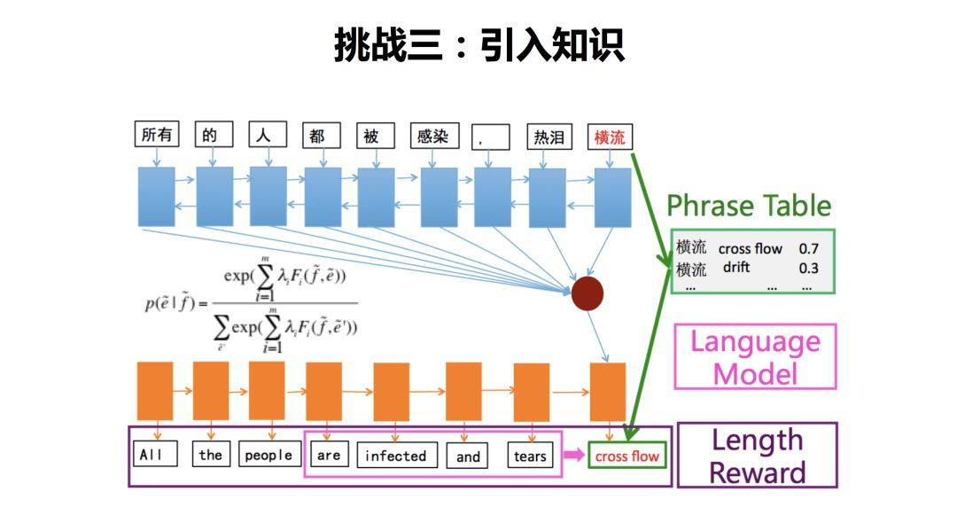 那么我们做一个什么样的工作呢?我们引入了几种知识,第一种就是叫短语表或者叫词表。如果发现『横流』这个词没有被翻译出来,我们就去查这个词典,这个词典就作为一个外部知识被引入进来了。同时,那我们还引入了一个语言模型,语言模型去衡量目标语言的这个句子是不是流畅。同时,我们引入一个长度奖励特征去奖励长句子。因为句子越长,可能漏掉的信息就越少。这个工作首次将统计机器翻译中的特征引入神经网络翻译,可以作为引入知识的一个框架。