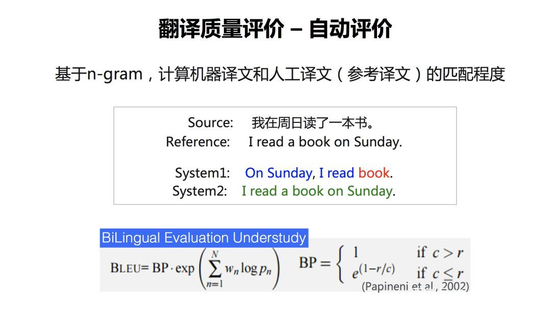 第二种,自动评价。自动评价能够快速地反映出一个机器翻译的质量好还是不好,相比人工评价而言,自动评价成本低、效率高。