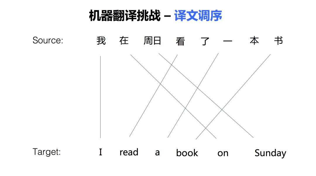 第二个挑战,是词语顺序的调整。由于文化及语言发展上的差异,我们在表述的时候,有时候先说这样一个成份,后面说另外一个成份 ,但是,在另外一种语言中,这些语言成分的顺序可能是完全相反的。比如在这个例子中,『在周日』,这样一个时间状语在英语中习惯上放在句子后面。再比如,像中文和日文的翻译,中文的句法是『主谓宾』,而日文的句法是『主宾谓』,日文把动词放在句子最后。比如中文说『我吃饭』,那么日语呢就会说『我饭吃』。当句子变长时,语序调整会更加复杂。