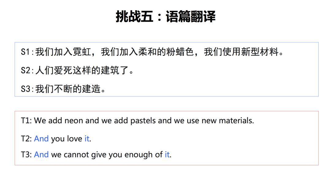 还有第五个挑战 ,是机器翻译长期以来面临的挑战,语篇翻译。大部分的翻译系统现在所使用的翻译方法都是基于句子,以句子作为单位,一个句子一个句子的进行翻译。单看这三个句子翻译还可以接受。但是连起来看就觉得生硬不连贯。