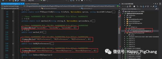 那么问题来了:这么多个dll怎么查找我们想要的信息呢?回过头看下插件的两个界面及PackageContents.xml文件便能找到些蛛丝马迹。插件的几个菜单按钮记录在PackageContents.xml文件中的:分别是AboutOBJExporter、SaveAsOBJ和OBJPreferences。这三个关键函数一定存在于OBJExporterForAutoCAD.dll中。