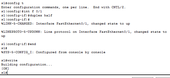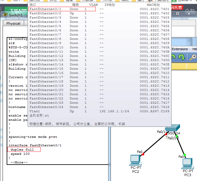 在配置模拟器,改了交换机上的端口0/1配置后,交换机到PC的状态由原来的导通变成了掉线状态。查了很久,原来是端口的duplex问题,设置成full了。