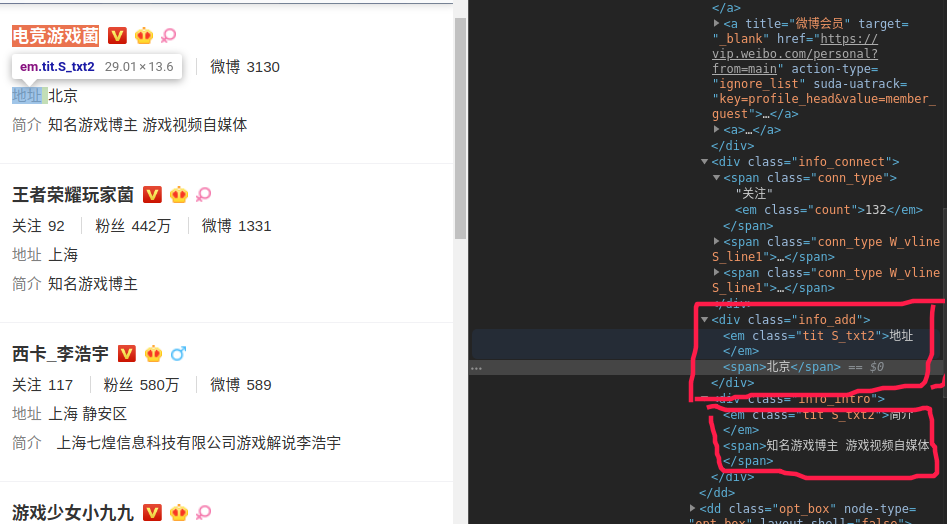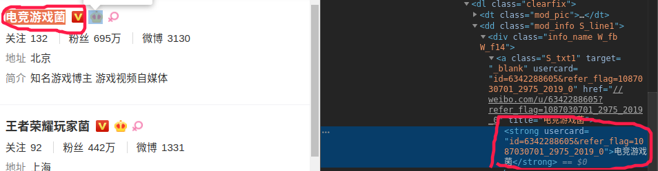 我们需要爬取游戏名人的姓名,关注量,粉丝量,微博量,地址和简介