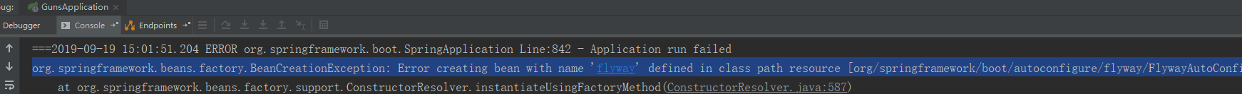 ===2019-09-19 16:08:43.241 WARN org.springframework.boot.web.servlet.context.AnnotationConfigServletWebServerApplicationContext Line:558 - Exception encountered during context initialization - cancelling refresh attempt: org.springframework.beans.factory.BeanCreationException: Error creating bean with name 'flywayInitializer' defined in class path resource [org/springframework/boot/autoconfigure/flyway/FlywayAutoConfiguration$FlywayConfiguration.class]: Invocation of init method failed; nested exception is org.flywaydb.core.internal.sqlscript.FlywaySqlScriptException:
