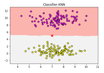 print("\n新数据点归类为:", clf.predict([7,5]), "\n")