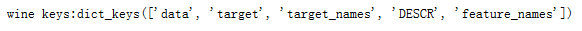 其中“data”为数据,“target”为目标分类,“target_names”为分类名,“DESCR”为描述(description),“feature_names”为特征变量名。