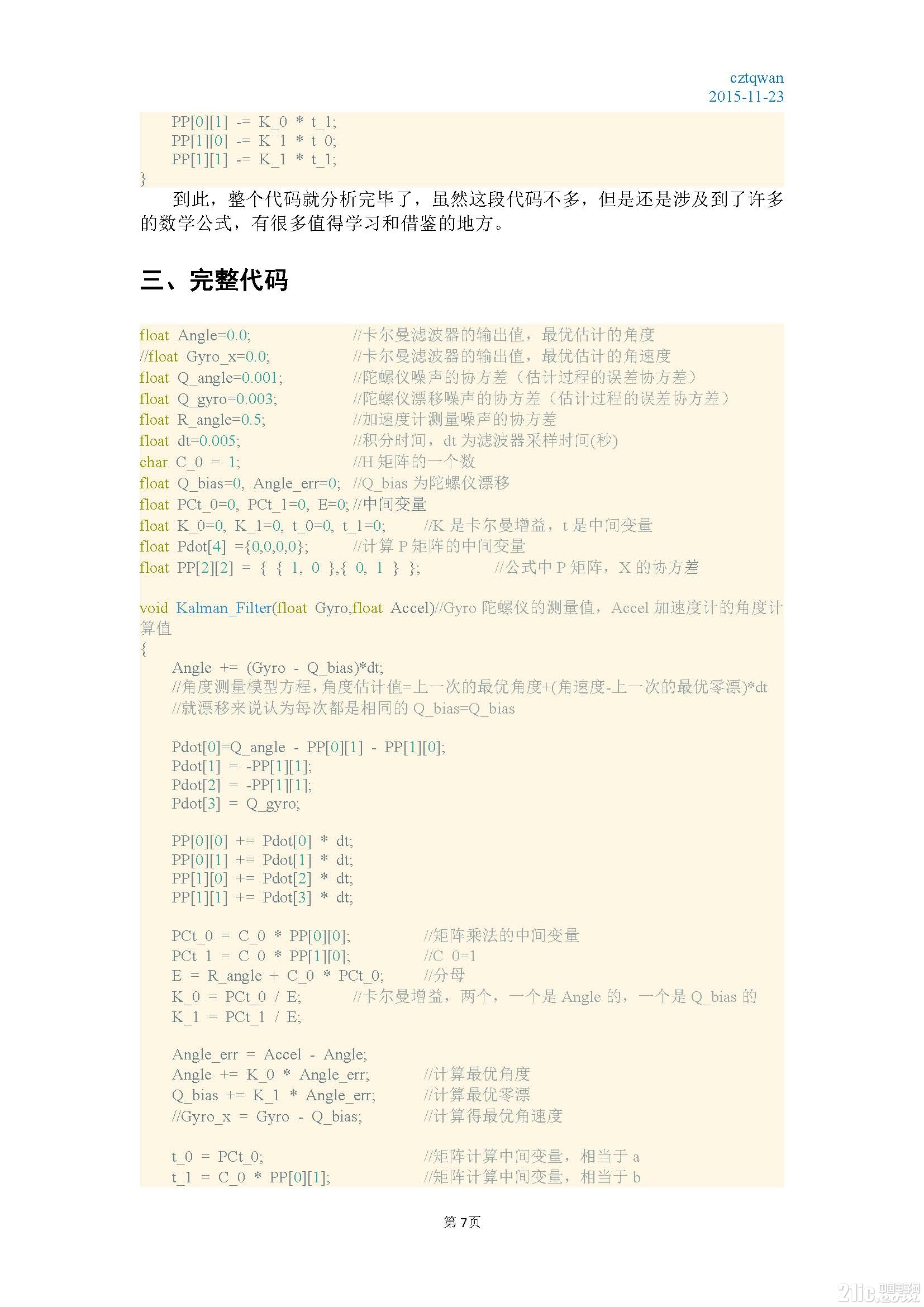 void Kalman_Filter(float Gyro,float Accel)//Gyro陀螺仪的测量值,Accel加速度计的角度计算值