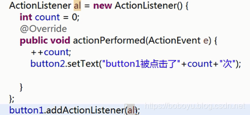 结论:一个匿名内部类实现代码保证了只能被用来创建一个监听器对象,被一个组件使用,并且能访问类的私有属性