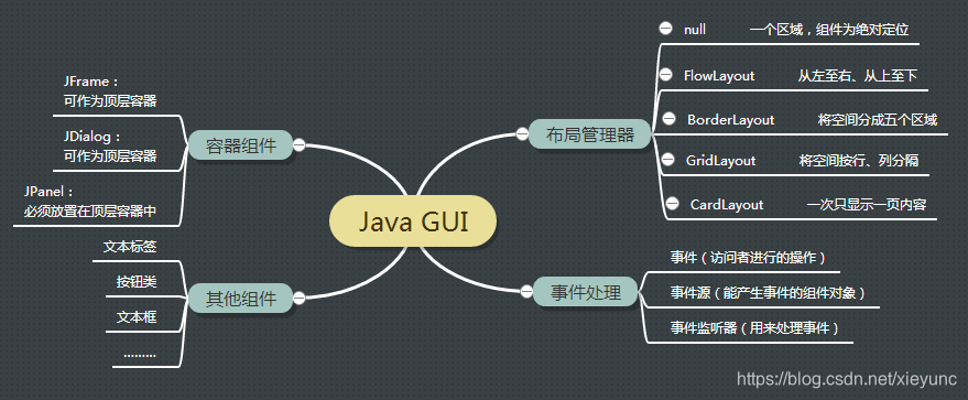 想在窗体上添加组件,我们就应该清楚是要在窗体的哪一部分添加组件,而窗体本身的区域就是容器(Container类型),我们可以通过获取getContentPane()方法获得Container对象,然后可以创建组件,通过add方法将组件添加到容器中,而这个组件添加进去在容器中怎么放置就是“布局”。