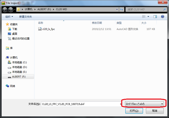 1、点击菜单file→input,右下角文件类型改成DXF,选中需要导入的DXF文件。