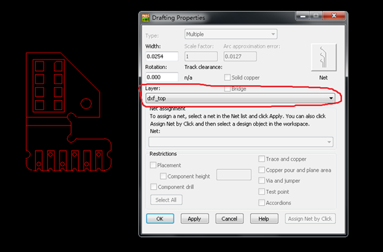 6、根据TOP面和BOT面,设置两个DXF文件的layer属性,改为dxf-top和dxf-bottom,全选图形,右击选择properties进行修改。