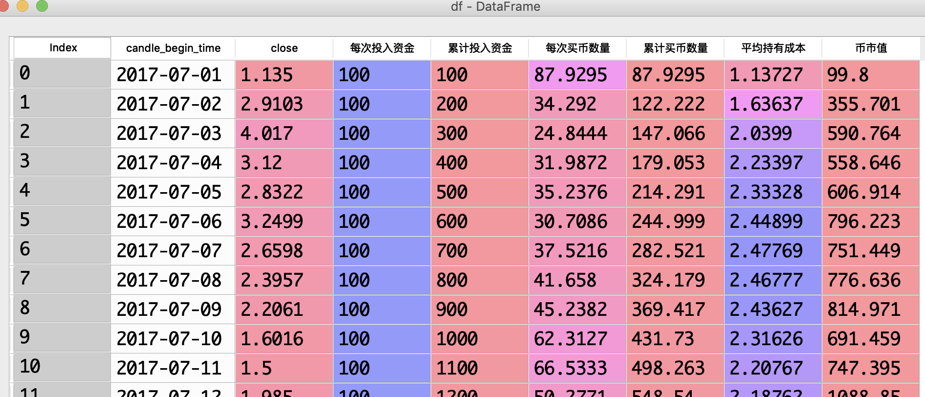 print(df[['candle_begin_time', 'close', '累计投入资金', '币市值', '平均持有成本']])