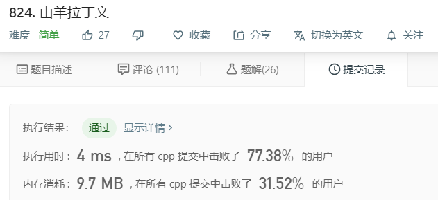 S中仅包含大小写字母和空格。单词间有且仅有一个空格。1 <= S.length <= 150。
