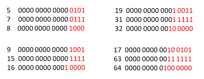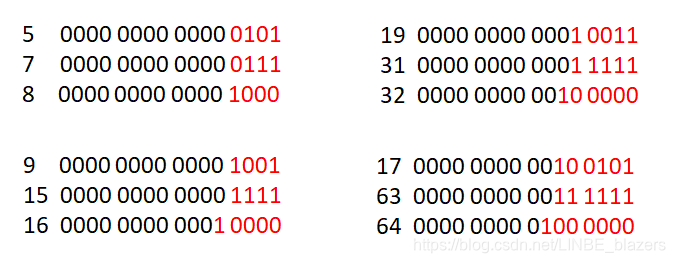 关注上面几个例子中红色字体部分的变化情况,有如下规律:5->8、9->16、19->32、37->64都是主要经过了两个阶段。