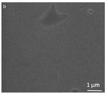 在生长了8μm的Ge之后,表面由细长的微晶制成,该微晶由间隙隔开,宽度为几十纳米,完美地平铺了基板,如图1a所示。图1b显示了生长之后的原位热退火循环后的Ge表面,该循环包括6个循环,每个循环2分钟(600°C到800°C)。