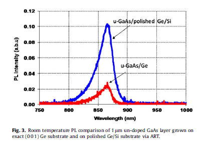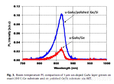 在低温缓冲层上生长100 nm GaAs后。下图为生长样品的室温PL谱。两种PL光谱都显示在867 nm处有一个干净的带隙发射,表明在砷化镓层内没有形成基于锗的复合物。然而,生长在Ge/Si衬底上的GaAs层的PL强度大约是生长在001 Ge衬底上的GaAs层的5倍,这是由于GaAs/Ge/Si结构中的APD减少所致。