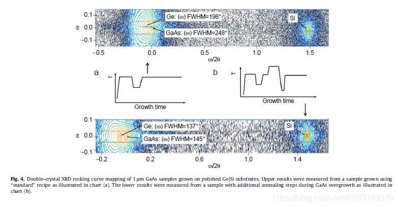 Si上直接外延生长GaAs,遇到的阻碍:Si衬底和外延层之间的晶格失配(GaAs / Si,差约为4.2%)引起的螺纹位错;热膨胀系数之间的差异(对于GaAs / Si,约为123%),导致晶圆弯曲并在外延层中形成裂纹;IV族材料(Si和Ge)是非极性晶体。当III-V族化合物半导体(极性晶体)在Si(或Ge)(001)衬底上生长时,可能会形成反相畴。