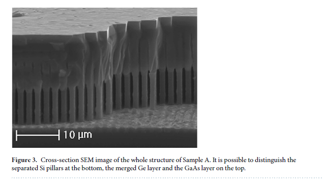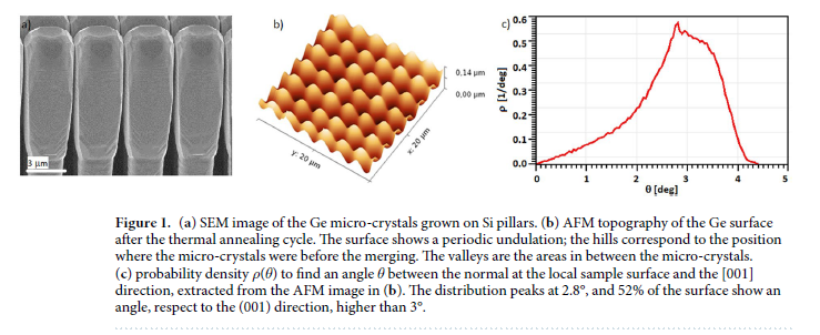 Ge 3D微晶的生长是在低能等离子体增强化学气相沉积(LEPECVD)工具中进行的。在深图案化的(001)Si衬底上生长8μm厚的Ge层。基板由2μm×2μm的方形立柱构图,间距为1μm。柱子之间的沟槽深度为8μm。