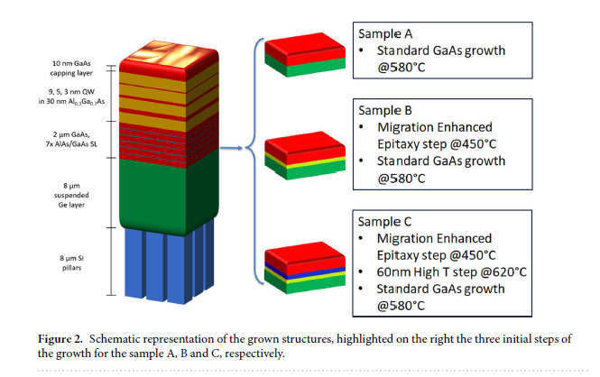 然后使用三种不同的策略来启动GaAs外延层的生长(见图2),报告了三个样品A,B和C的方案。生长的样品的表面形貌通过原子力显微镜(AFM)测量在攻丝模式下工作,并使用横向分辨率为20 nm的硅尖端。传统的扫描电子显微镜(SEM)用于获取生长结构的图像。