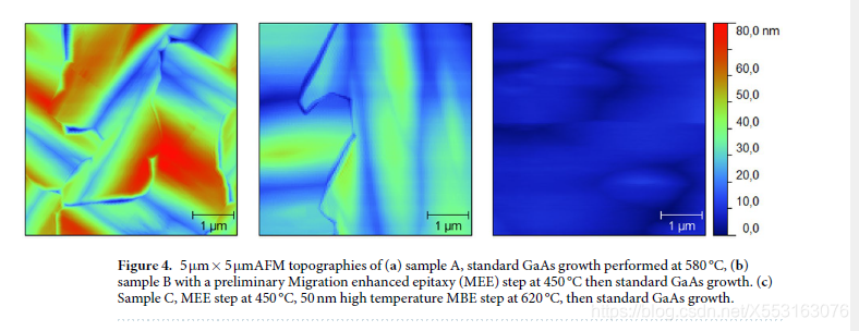 高迁移率的低温步骤可实现高密度岛的形核,从而有利于AP畴在距界面几纳米的范围内消失,并产生较低密度的无序缺陷,如堆垛层错和孪晶。样品B表面粗糙度减小(RMS = 8.1nm)。区域尺寸大于样品A中的尺寸,平均尺寸达到5μm。尽管如此,在样品B中观察到的AP边界密度仍然远非Si上光电集成的最佳密度。MOVPE的生长温度高于MBE。在低温步骤之后通常的MBE的简单模拟程序可能会达不到 AP边界分解的温度。因此,在样品C中引入了三温度程序。在MEE步骤中对岛形核之后,执行了高温生长步骤,其中在620°C的温度下生长60 nm的GaAs以促进AP边界解离。如预期的那样,样品C(图4c)呈现单个AP域,覆盖图片中所示的所有5μm×5μm区域。表面粗糙度很小(RMS = 2.2 nm)。平均而言,样品C中AP域的横向尺寸为8μm。尽管如此,在表面上仍存在大面积的畴,并且有可能找到横向尺寸达到30μm的畴。
