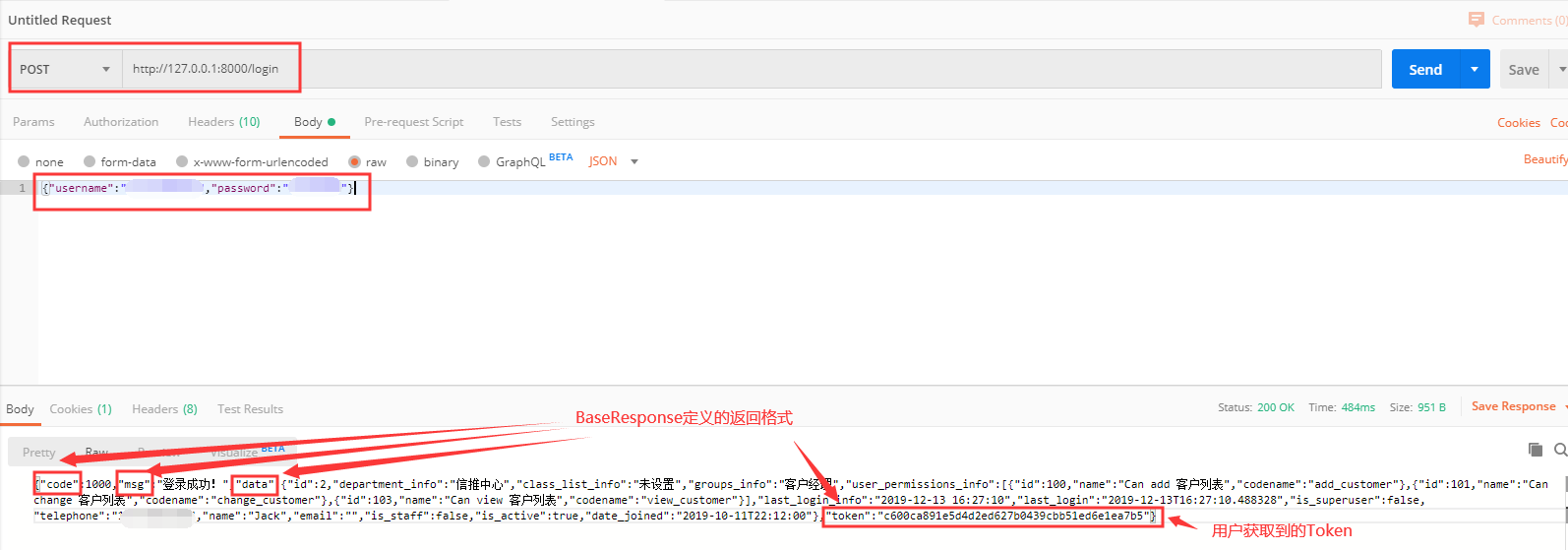 # 从request中获取数据, 数据格式必须为 {"username":"用户名","password":"密码"}