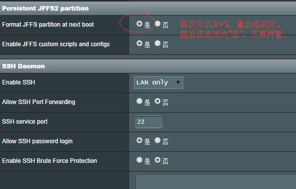 1.开启jffs和ssh(或telnet),登陆路由器管理界面,通过系统管理-系统设置开启jffs和ssh(或telnet,需要重新启动,格式化jffs)如下图: