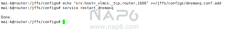 echo “srv-host=_vlmcs._tcp,router,1688”>>/jffs/configs/dnsmasq.conf.add