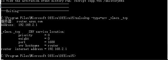 以上四行的大意是:1.切换到office2013目录;2.设置激活服务器地址为192.168.2.1,即你的内网kms服务器地址(即路由地址);3.激活;4.查看激活状态。得到返回信息如下: