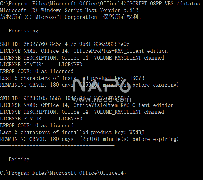 其中第一行切换到office目录,第二行表示清除之前设置的kms激活服务器地址,第三行手动激活,第四行显示激活状态。最终看到信息: