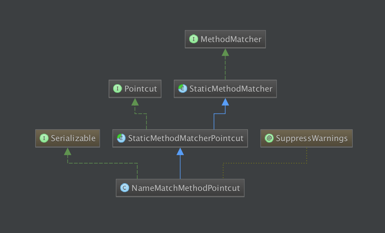默认的pointcut实现有:NameMatchMethodPointcut,JdkRegexpMethodPointcut,AspectJExpressionPointcut等。这里对NameMatchMethodPointcut与AspectJExpressionPointcut做下简单介绍。